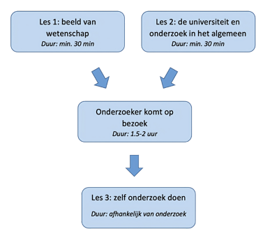 In les 1 leren leerlingen meer over onderzoekers en bedenken ze vragen voor de onderzoeker. In les 2 leren leerlingen meer over de Radboud Universiteit en de laboratoria die daar te vinden zijn. De tijdsduur per les is ongeveer 40 minuten als je de volledige les uitvoert. Les 3 helpt je om leerlingen te begeleiden bij het uitvoeren van een onderzoek. De bezoekende onderzoeker zal samen met de leerlingen een onderzoeksvraag bedenken.