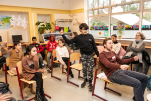 Prof. dr. Annabelle Dufourq kijkt mee, terwijl leerlingen van IMC weekendschool verschillende emoties uitbeelden. (Foto: Jimmy Israël)