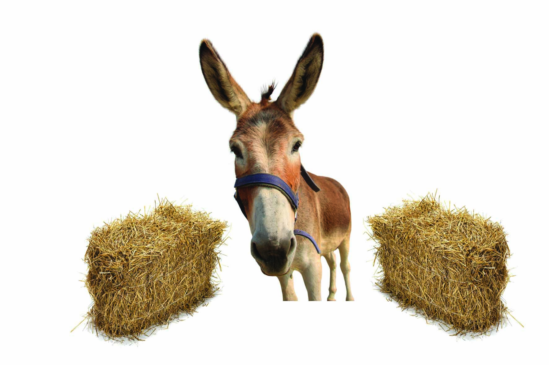 De ezel zit tussen twee hooibalen en heeft honger. Beide hooibalen zijn even groot, even ver bij hem vandaan, even geel en ze ruiken even lekker. Kortom, twee exact dezelfde hooibalen.